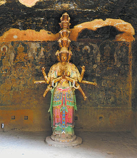 2013年9月4日中午時分,一場秋雨讓炳靈寺石窟前的水流比平日里急了幾分,渾濁的黃河水拍打著岸邊的堤壩,不遠(yuǎn)處的寺院傳來鐘聲,在狹長的山谷中激起回響,愈發(fā)襯托出這座千年石窟的幽靜。多雨時節(jié),游人稀少,我們得以放慢腳步,穿行在這綿延1600多年的石窟長廊中,用心體會佛教藝術(shù)給人帶來的平和寧靜。