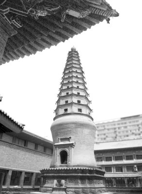 現(xiàn)蘭州市博物館所在地城關(guān)區(qū)慶陽(yáng)路110號(hào)院,是屬原明代白衣寺院。白衣寺院始建于明崇禎四年(公元1631年),因寺內(nèi)大殿繪有白衣大士像而得名。原寺院由北向南開(kāi),寺內(nèi)建筑物有:正面是大門、白衣菩薩大殿,多子塔(又名白衣寺塔),塔后是二層樓的觀音閣(一樓)、文昌宮(二樓)。東側(cè)由南向北依次是伽藍(lán)祠、送子將軍祠、送子催生子孫三慈母宮。西側(cè)由南向北依次是土地祠、廁所,旃檀神王廟、眼光痘疹廟三慈母宮(參見(jiàn)原白衣寺平面圖)。后經(jīng)多次戰(zhàn)亂,致使僧去寺毀,只有白衣寺塔幸存至今。白衣寺塔屬實(shí)心磚塔,高約三十米。塔基為錯(cuò)牙式方形,長(zhǎng)、寬各約七米,高約二點(diǎn)八米,四面鐫刻青磚花卉圖案。塔身下部呈覆缽狀,高約八米,最膨大處直徑約六米。正面與塔基連結(jié)處開(kāi)有一個(gè)佛龕。龕內(nèi)原供佛像三尊,現(xiàn)已無(wú)存。龕外兩側(cè)嵌有磚雕對(duì)聯(lián)一副,對(duì)聯(lián)原文是:“玉柱玲瓏通帝座;金城保障永皇圖”,橫額是:“聳瞻震旦”。從題款“太華道人崇禎辛未夏之吉”來(lái)考證,這幅磚雕對(duì)聯(lián)很可能屬明肅王識(shí)钅宏(末代肅王)所書(shū)手筆。據(jù)說(shuō)識(shí)钅宏尊崇道教,“太華道人”是他的別號(hào)。塔身上部呈八角形錐體,高約十八點(diǎn)五米,共做密檐十二層,每層每面各開(kāi)佛龕一個(gè),內(nèi)塑佛像一尊,共計(jì)九十六尊;每層每角懸掛風(fēng)鈴一個(gè),共計(jì)九十六個(gè)。塔剎高約一米,形若寶瓶,用外面鍍銅的金屬制作。按照慣例,佛塔的層數(shù),從一層到十五層,多為奇數(shù)。而白衣寺塔的層數(shù)卻是偶數(shù),這種情況在佛塔中比較少見(jiàn)。當(dāng)初設(shè)計(jì)者是否把開(kāi)有佛龕的覆缽狀部分也算作一層,現(xiàn)已從考證。白衣寺塔建成后,經(jīng)受了將近四百余年的風(fēng)雨侵蝕和多次地震的搖撼,特別是公元1939年?yáng)|關(guān)火藥庫(kù)大爆炸的震動(dòng),至今仍孤標(biāo)獨(dú)秀,玉立無(wú)傾,真可謂蘭州建筑史上的奇跡之一。此塔現(xiàn)已成為蘭州市區(qū)的一大景觀。