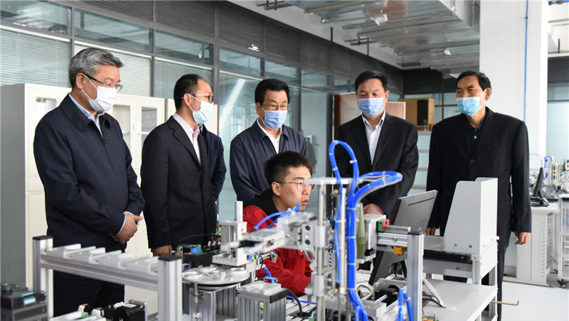 林鐸首先來(lái)到蘭州新區(qū)職教園區(qū)公共實(shí)訓(xùn)中心,聽取園區(qū)總體情況介紹,走進(jìn)車間同師生親切交流,察看工業(yè)4.0示范生產(chǎn)線,了解物流操作、先進(jìn)設(shè)備生產(chǎn)加工、化工生產(chǎn)和安全、現(xiàn)代制造生產(chǎn)模式和研發(fā)等培訓(xùn)情況。他勉勵(lì)學(xué)生刻苦學(xué)習(xí),掌握一技之長(zhǎng),成為有用之材。林鐸強(qiáng)調(diào),要緊跟發(fā)展趨勢(shì),緊扣社會(huì)需求和產(chǎn)業(yè)需求,創(chuàng)新辦學(xué)理念,強(qiáng)化軟硬件建設(shè),大力推進(jìn)產(chǎn)教融合、校企合作,提升職業(yè)教育現(xiàn)代化水平。要嚴(yán)格教學(xué)管理,啟發(fā)學(xué)生創(chuàng)新思維,注重實(shí)踐操作,培養(yǎng)精益求精的工匠精神,做到教學(xué)高質(zhì)量、實(shí)訓(xùn)高水平、學(xué)生高素質(zhì),為全省乃至西部地區(qū)發(fā)展培養(yǎng)更多專業(yè)技術(shù)人才。