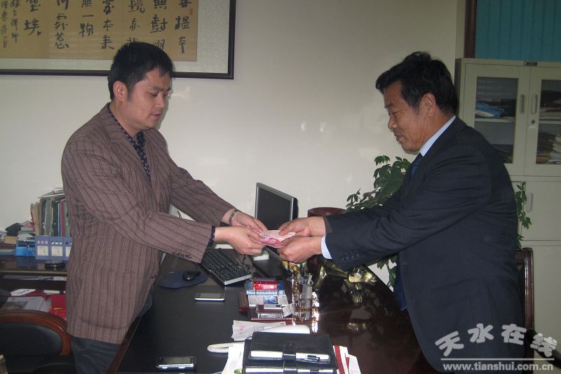 黨員趙金山(左)向黨支部書記吳國壽(右)繳納特殊黨費