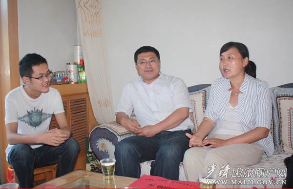 6月29日下午,麥積區(qū)委常委、宣傳部長王曙輝,副區(qū)長楊鐵森及區(qū)教體局、市九中負(fù)責(zé)人一行看望了2012年甘肅省高考理科狀元麥積區(qū)道北街道道北社區(qū)唐博,對他和他的父母、老師表示祝賀,并為其頒發(fā)獎(jiǎng)金10000元。