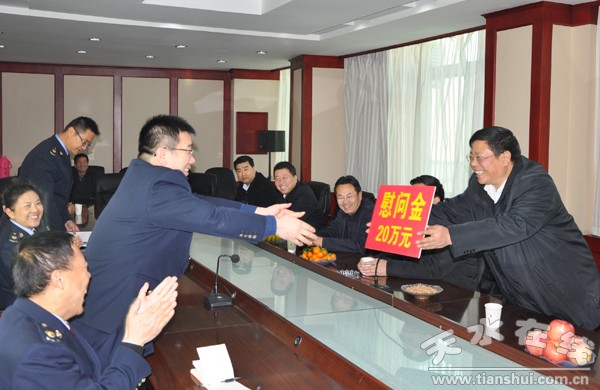 12月31日,麥積區(qū)四大組織在家領(lǐng)導(dǎo)張智明、賈應(yīng)珍、何東、楊續(xù)祥、邵長鋒,帶領(lǐng)區(qū)委辦、區(qū)人大辦、區(qū)政府辦、區(qū)政協(xié)辦負責(zé)人,深入財稅系統(tǒng)進行看望慰問活動,感謝他們一年來為全區(qū)經(jīng)濟發(fā)展做出的突出貢獻,祝福各位干部職工新年愉快,萬事如意,同時希望在新的一年里,再接再厲,努力為麥積經(jīng)濟發(fā)展做出新的更大的貢獻。