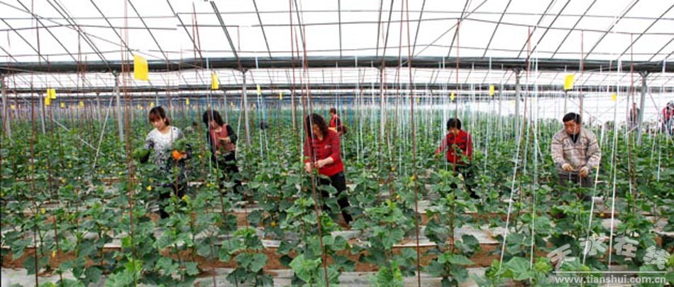 (天水森泰農(nóng)業(yè)綜合開發(fā)有限公司的日光溫室大棚里,黃瓜已經(jīng)探出翠綠的刺頭,西紅柿掛上了青澀的果實(shí)。)
