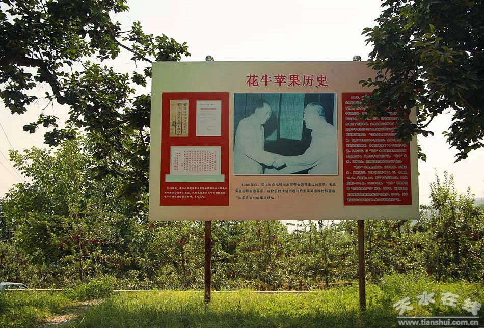 1965年,在香港國(guó)際博覽會(huì)上,“花!碧O(píng)果因其色度、果型、肉質(zhì)、含糖等四項(xiàng)指標(biāo)均優(yōu)于美國(guó)“蛇果”而一舉奪魁,享譽(yù)全球。這一消息傳來(lái),花牛村人都興奮不已。當(dāng)年9月23日,甘肅省天水縣花牛寨生產(chǎn)大隊(duì)的社員們精心挑選出兩箱剛剛采摘的蘋(píng)果給毛主席寄去,以表達(dá)對(duì)主席的敬仰之情,毛主席品嘗后,非常喜愛(ài),并在家中會(huì)見(jiàn)時(shí)任甘肅省省長(zhǎng)的天水籍著名人士鄧寶珊時(shí)用天水蘋(píng)果招待他,稱(chēng)贊道:“你家鄉(xiāng)天水的蘋(píng)果好吃!”此后,中共中央辦公廳代表毛主席向花牛村村民專(zhuān)門(mén)致函感謝,信中還夾寄了44.82元錢(qián);ㄅ4鍖⒏兄x信勒石樹(shù)碑,永志紀(jì)念。
