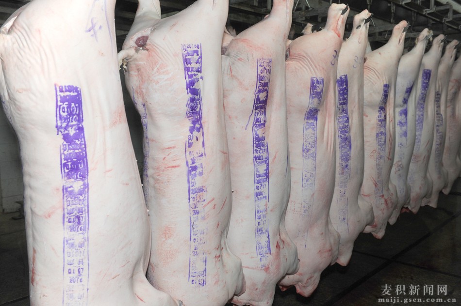 1月6日,天水市麥積區(qū)康晟生豬定點(diǎn)屠宰場,麥積區(qū)畜牧獸醫(yī)局6名動(dòng)物衛(wèi)生檢疫人員正在對屠宰的近百頭生豬進(jìn)行衛(wèi)生檢疫。