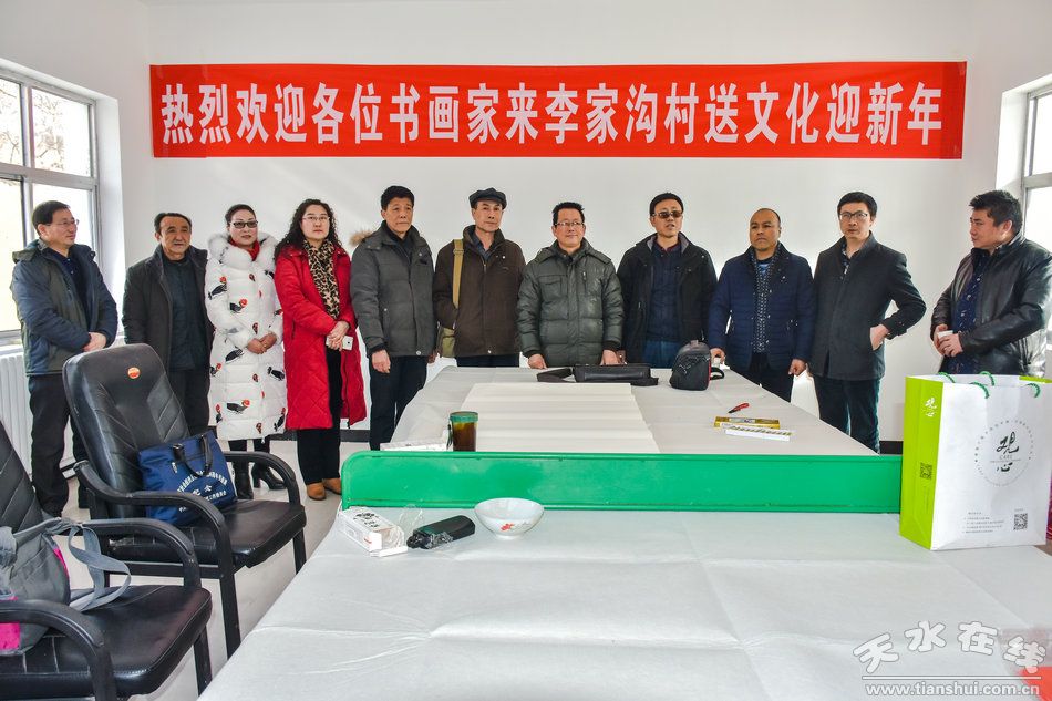 麥積區(qū)文聯(lián)主席吳全通作了熱情洋溢的講話。他說(shuō),連日來(lái),我們參加區(qū)上組織的文化科技衛(wèi)生三下鄉(xiāng)活動(dòng),各位藝術(shù)家們很辛苦,但參加李家溝村的這樣一場(chǎng)活動(dòng),為鄉(xiāng)親們做這樣一件實(shí)實(shí)在在、看得見(jiàn)摸得著的實(shí)事好事,我們感到很有意義。吳主席還代表書(shū)畫(huà)家、攝影家們向李家溝村的全體村民們提前拜年!希望書(shū)畫(huà)家、攝影家們創(chuàng)作的書(shū)法、美術(shù)、攝影作品,大紅春聯(lián)、大紅的“!弊纸o李家溝村人民帶來(lái)吉祥和幸福。
