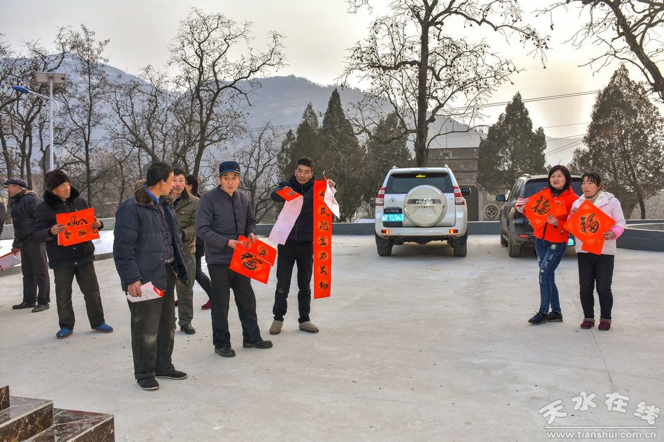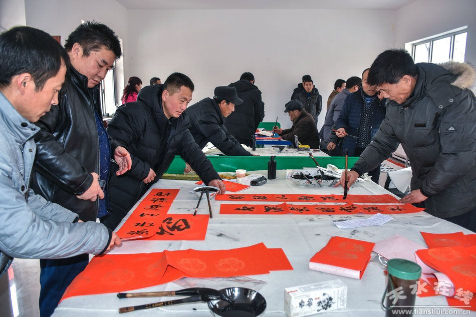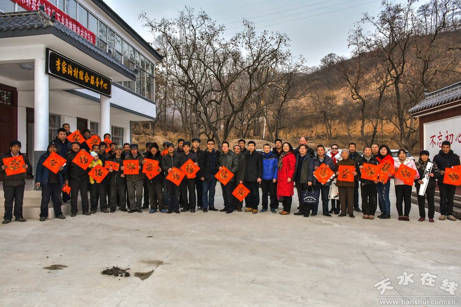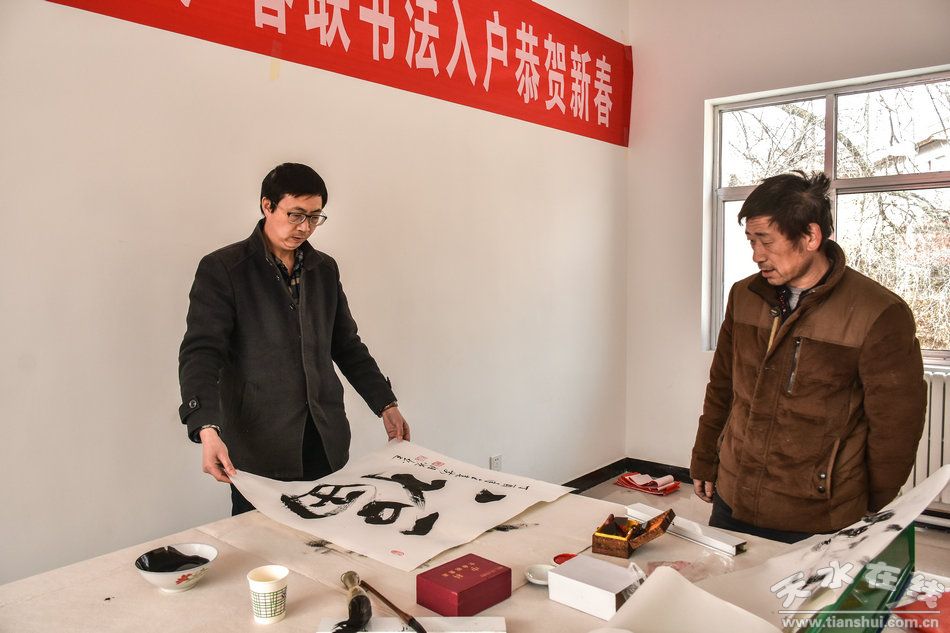 據(jù)悉:“文化下鄉(xiāng)助推精準(zhǔn)扶貧,春聯(lián)書(shū)畫(huà)進(jìn)村入戶恭賀新春”是系列活動(dòng)之一。第一書(shū)記兼駐村幫扶工作隊(duì)隊(duì)長(zhǎng)喬理介紹說(shuō):這次活動(dòng)是為了認(rèn)真貫徹落實(shí)黨的十九大精神,在建設(shè)美麗鄉(xiāng)村,認(rèn)真落實(shí)麥積區(qū)“1+18”精準(zhǔn)扶貧方案和真扶貧、扶真貧,大力發(fā)展培育李家溝村支柱產(chǎn)業(yè),發(fā)揮地域優(yōu)勢(shì),改善完善村基礎(chǔ)設(shè)施建設(shè)的基礎(chǔ)上,結(jié)合村情民意,為助推精準(zhǔn)扶貧,活躍李家溝村村民節(jié)日期間的文化生活,滿足村民精神文化需求,喜迎新春佳節(jié)而舉辦的。在前一階段區(qū)地方稅務(wù)局物質(zhì)幫扶、節(jié)日慰問(wèn)送溫暖的基礎(chǔ)上,再邀請(qǐng)各位藝術(shù)家來(lái)村上,為村民們寫(xiě)春聯(lián)、“!弊、書(shū)畫(huà)作品和中堂,拍攝照片,目的就是要讓群眾熱熱鬧鬧過(guò)一個(gè)溫暖祥和文明歡樂(lè)的春節(jié)。