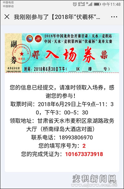 3、2018年6月29日上午9點--11:30,下午3:00--5:30攜帶您的手機(搶票微信)到天水市麥積區(qū)泉湖路政務(wù)大廳(橋南綠島大酒店對面)進(jìn)行簽到確認(rèn),領(lǐng)取入場券。
