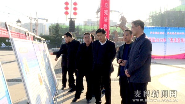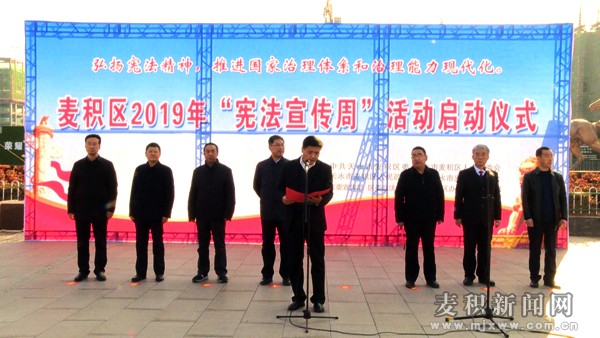 麥積區(qū)融媒體中心訊(記者 李欣 何彤彤)12月2日,麥積區(qū)2019年“憲法宣傳周”活動(dòng)啟動(dòng)儀式在馬跑泉市政廣場(chǎng)舉行。麥積區(qū)委常委、政法委書記、公安分局局長(zhǎng)杜崢嶸,區(qū)委常委、宣傳部部長(zhǎng)閻小鵬,區(qū)人大常委會(huì)副主任方明太,區(qū)政協(xié)副主席成映平,區(qū)法院院長(zhǎng)余翔,區(qū)檢察院檢察長(zhǎng)張國(guó)倉出席啟動(dòng)儀式。區(qū)政府副區(qū)長(zhǎng)溫建軍主持啟動(dòng)儀式。