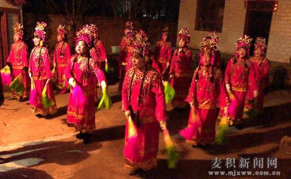 除了“殺年豬”,紅崖村人過年還有另外一件大事需要完成,那就是為正月里的夜秧歌進行的提前排練。據(jù)介紹,作為夜秧歌的主要表演內容——天水小曲的表演在紅崖村由來已久,每年到臘月初,外出務工的人們回家后,大家都會聚在一起開始排練,以此來慶祝春節(jié)。