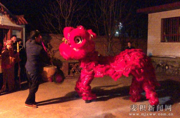 一邊是熱鬧的天水小曲,另一邊多才多藝的村民們還自發(fā)組織了舞龍舞獅、業(yè)余秦腔表演。在排練的時候村民們裝扮整齊,激情高昂,時而騰空一躍,時而蜿蜒低回,舞龍表演威武靈動,舞獅和秧歌表演則活靈活現(xiàn)。村民們用熱鬧、精彩的節(jié)目表達出了對新春的美好祝愿,傳遞出了他們對生活的熱情和濃濃的專屬于農(nóng)村的年味。