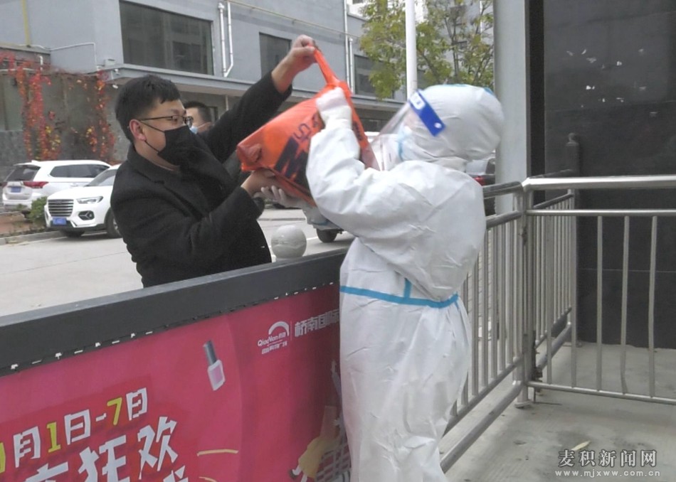 在采訪過程中,記者觀察到小區(qū)門口不時有車輛為居民運(yùn)送生活物資。為了確保居民與外界不直接接觸,身著防護(hù)服的志愿者們不辭辛勞地一次次將物資轉(zhuǎn)運(yùn)到居民手中。前來拿取物資的居民馬芳紅看到志愿者們冒著寒風(fēng)還每時每刻都堅守在抗疫一線,只為給小區(qū)居民提供更好的服務(wù),她感動萬分:“我們生活在這個封控小區(qū),每天早上6點(diǎn)到7點(diǎn)之間都能做上核酸。我們井然有序排好隊,大家都做了核酸,離不開我們這些志愿者和白衣天使的辛苦和努力,下午還能把各住戶的菜或者物資都能送到住戶手里,確實很辛苦,給我們這些封控小區(qū)的志愿者跟這些一線人員點(diǎn)贊,天水加油!”