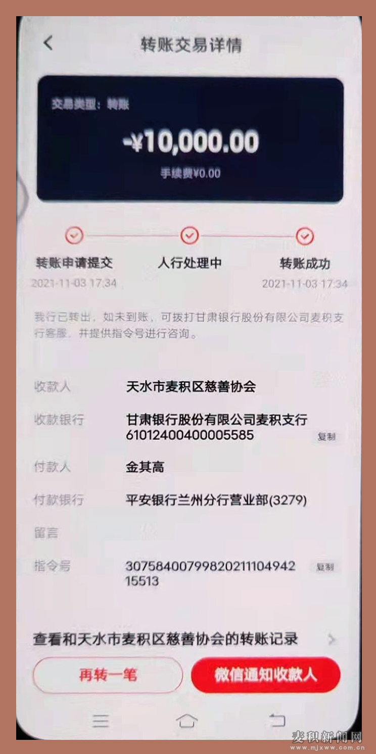 民建會員、麥積區(qū)盛源有限公司總經(jīng)理金其高,雖然他本人不在天水,但他時時刻刻牽掛著麥積區(qū)的疫情防控工作,并通過麥積區(qū)慈善協(xié)會捐款1萬元,用自己的微薄之力,助力戰(zhàn)勝疫情。