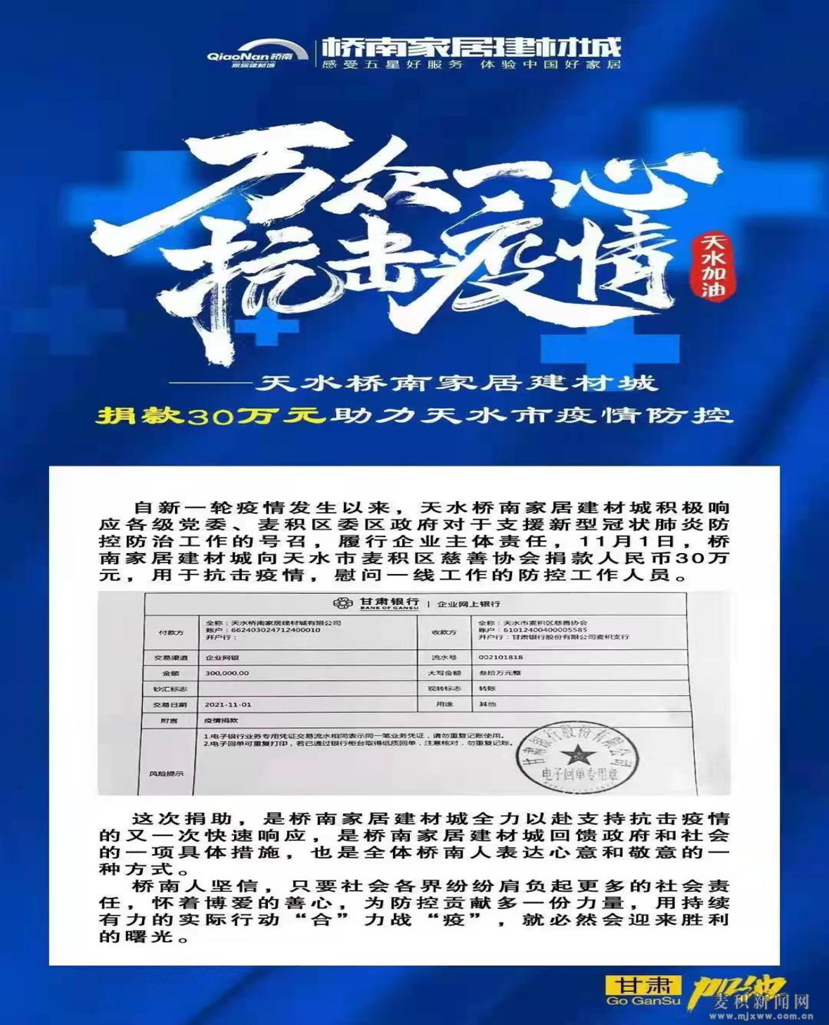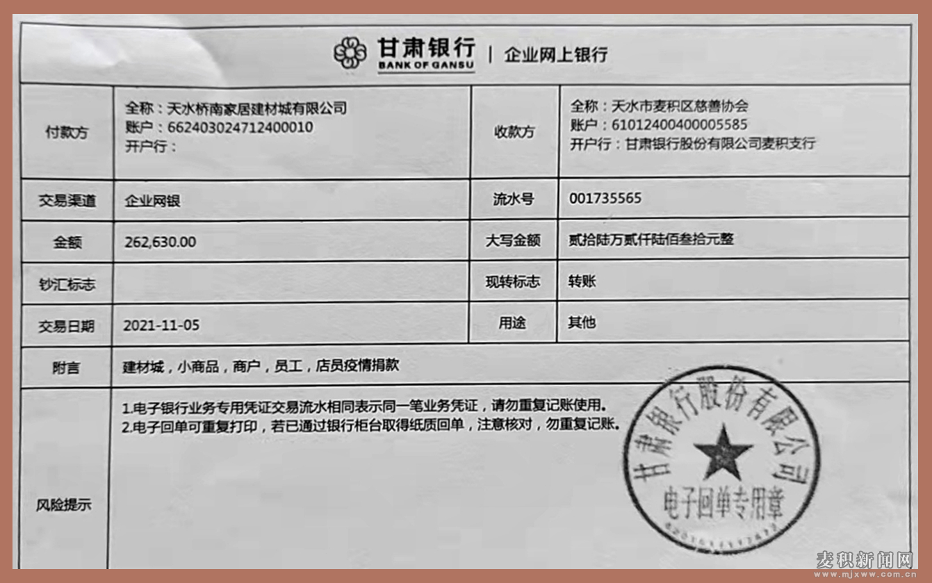 民建會員、天水橋南家居建材城有限公司董事長趙金鳳,積極響應(yīng)號召,迅速行動,慷慨解囊,向天水市麥積區(qū)慈善協(xié)會捐款人民幣30萬元。同時,天水橋南家居建材城有限公司、天水橋南服裝小商品城有限公司發(fā)動商戶和員工積極踴躍捐款,捐款金額達26.2萬余元,用于抗擊疫情。