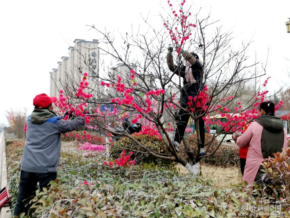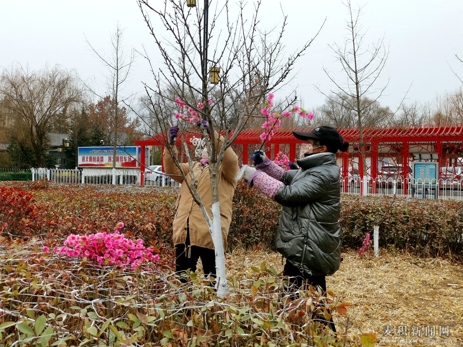 近日,在麥積區(qū)各個路段,隨處可見園林工人們忙碌的身影,他們冒著嚴寒有條不紊地進行樹體美化、懸掛大紅燈籠、安裝各種造型燈……在他們的辛苦作業(yè)下,原本光禿禿的枝頭便綴滿了靚麗的花朵,粉的、黃的、紅的、紫的……各品種、各顏色的仿真花爭相開放,隨風搖動,春天的氣息瞬間撲面而來。
