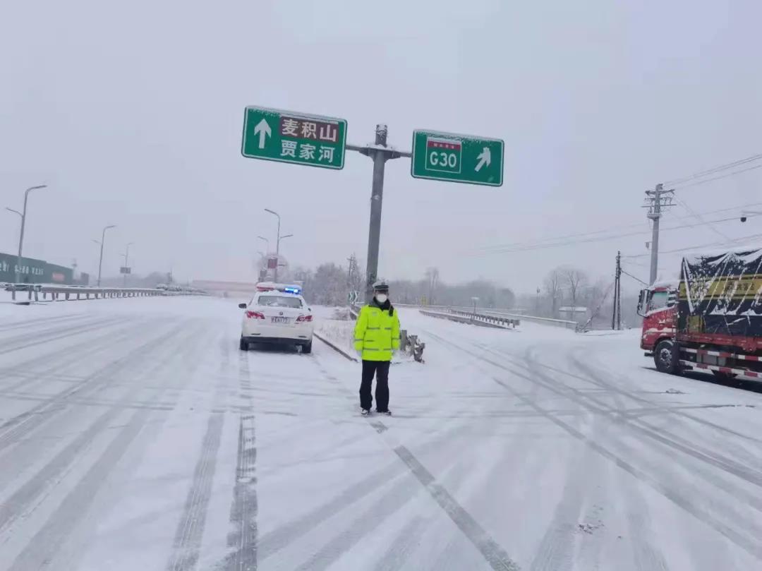 1月27日清晨,麥積區(qū)出現(xiàn)大范圍降雪,路面濕滑,能見度低,并伴有路面結(jié)冰情況,群眾出行受到嚴重影響。麥積公安分局交警大隊以雪為令,立即啟動惡劣天氣應急預案,加強雪天交通巡邏管控,全力保障道路交通安全暢通,嚴防發(fā)生車輛滯留和嚴重交通事故。