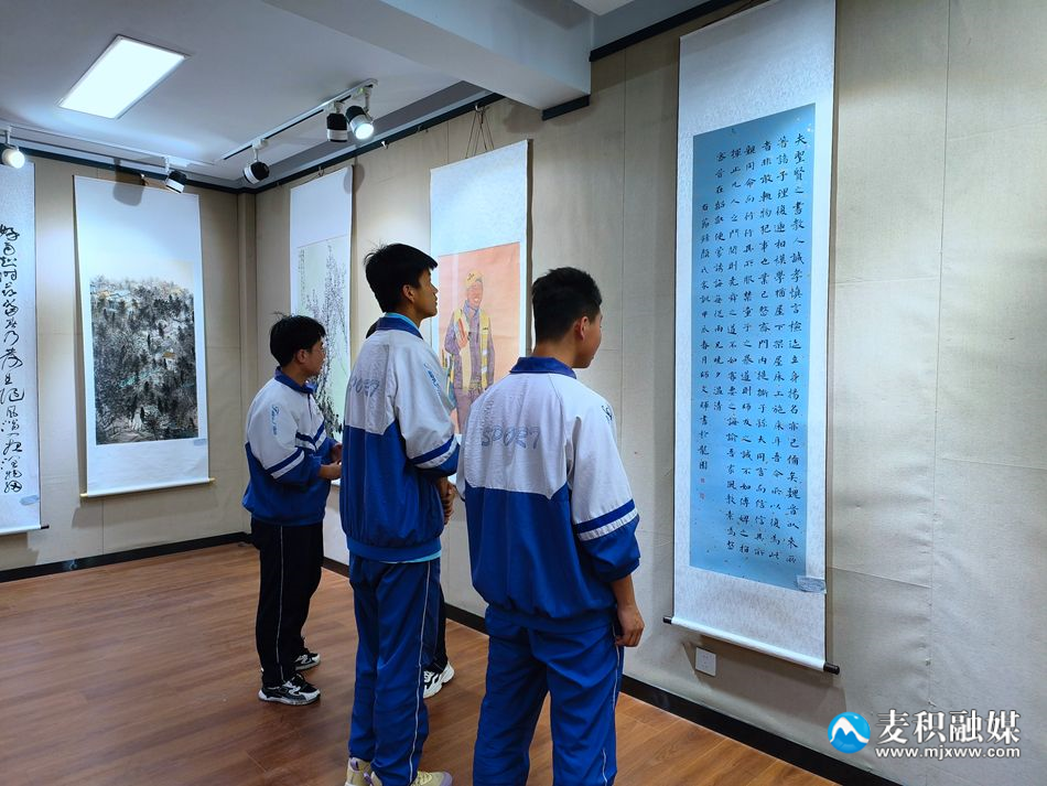 開展當(dāng)天,天水市第九中學(xué)組織學(xué)生到文化館參觀。展廳內(nèi),四十余幅書畫藝術(shù)作品熠熠生輝,它們或描繪祖國(guó)大好河山,或描繪青年視野下的國(guó)家發(fā)展道路和人民群眾的幸福生活。同學(xué)們?cè)谡箯d內(nèi)或駐足欣賞,或低聲交流,討論分享各自對(duì)書畫作品的理解及其蘊(yùn)含的深刻內(nèi)涵。