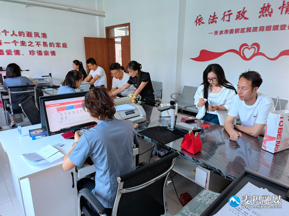 麥積區(qū)融媒體中心訊(記者 王博雅 胡旭東) 5月20日一大早,麥積區(qū)民政局婚姻登記處門口便排起了長(zhǎng)隊(duì)。許多情侶選擇在“520”這天登記結(jié)婚,因?yàn)橛兄C音“我愛(ài)你”的美好寓意,而今年又恰逢二十四節(jié)氣中的“小滿”,俗話說(shuō)“人生小滿勝萬(wàn)全”,在好日子的雙重加持下,麥積區(qū)民政局婚姻登記處迎來(lái)了2024年的結(jié)婚登記高峰。
