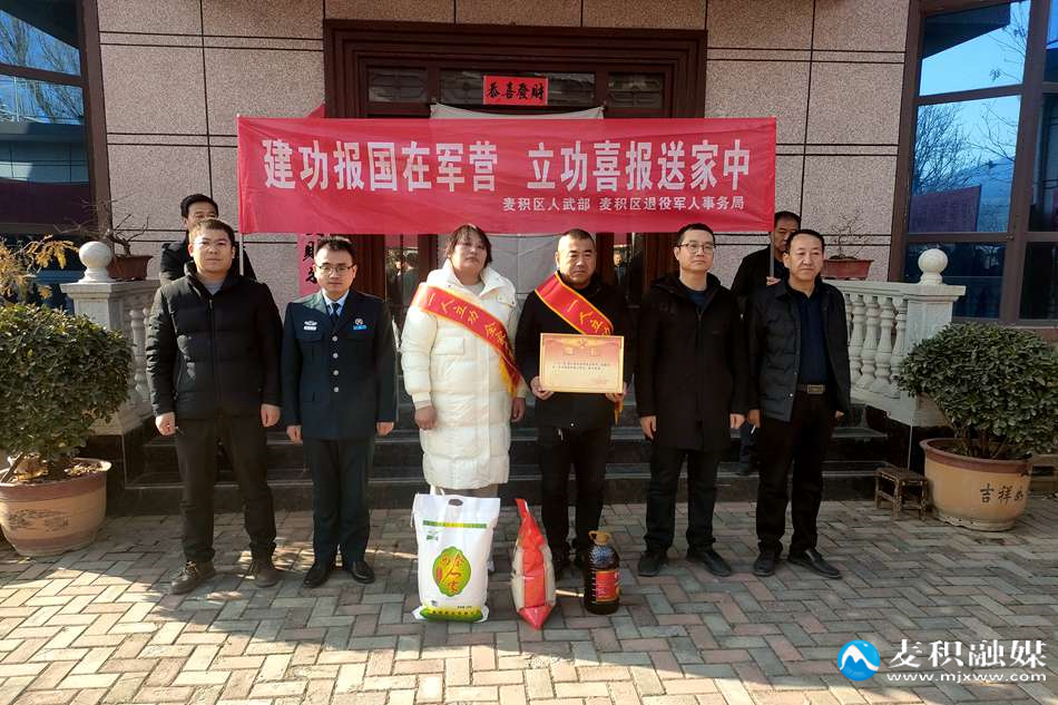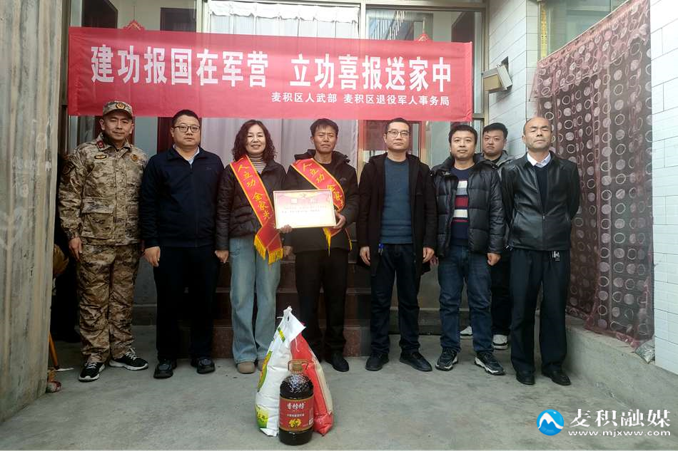 麥積區(qū)融媒體中心訊(記者吳雪镕胡旭東)為弘揚(yáng)擁軍優(yōu)屬光榮傳統(tǒng),增強(qiáng)軍人軍屬榮譽(yù)感,激勵(lì)軍人獻(xiàn)身國防和再建新功的熱情,近日,麥積區(qū)退役軍人事務(wù)局聯(lián)合區(qū)人武部開展“送立功喜報(bào)到家”活動(dòng),為馬跑泉鎮(zhèn)、甘泉鎮(zhèn)、石佛鎮(zhèn)、道北街道等鎮(zhèn)、街道榮立三等功的軍人親屬送去喜報(bào)。