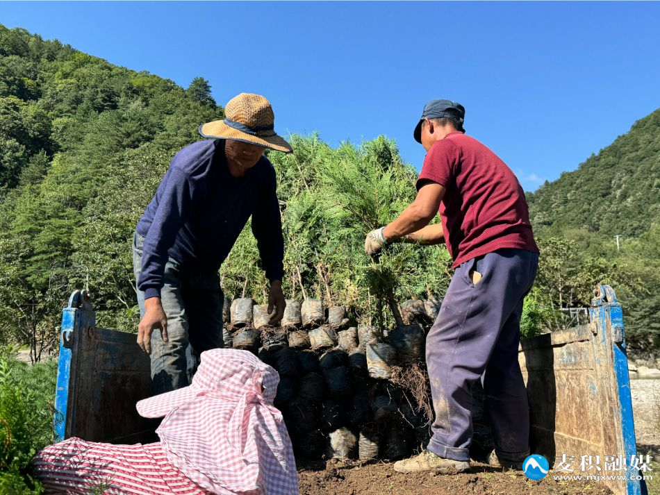 在苗木裝車點,現(xiàn)場一片繁忙火熱。挖苗、捆扎、搬運、裝車……村民們分工明確、動作嫻熟,一株株苗木整齊碼放,即將“走出大山”,為遠方的土地增添新綠。