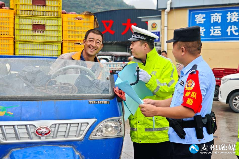 在伯陽(yáng)鎮(zhèn)蘋果交易市場(chǎng),紅彤彤的蘋果堆滿貨臺(tái),果農(nóng)們忙著分揀、包裝,滿載果品的車輛往來穿梭,一派豐收的繁忙景象。針對(duì)市場(chǎng)周邊車流、人流集中的特點(diǎn),麥積公安交警聯(lián)合當(dāng)?shù)嘏沙鏊窬v守現(xiàn)場(chǎng),向果農(nóng)、貨運(yùn)司機(jī)發(fā)放交通安全手冊(cè),并用通俗易懂的語(yǔ)言講解鄉(xiāng)村道路通行規(guī)則、貨物固定技巧及交通事故應(yīng)急處置方法,進(jìn)一步提升大家的交通安全意識(shí)。