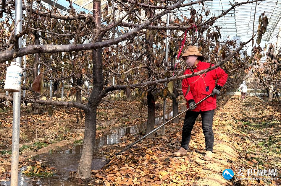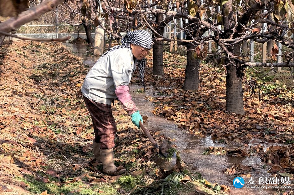 不遠(yuǎn)處的大棚區(qū)域,一行行櫻桃樹整齊排列,村民們正在將水流引向果樹根部。水流漫過樹間,又順著縫隙滲進(jìn)地里!拔髅泛蜋烟覙鋴少F,冬天得好好管護(hù)。適時澆灌封凍水、進(jìn)行根部培土,能增強(qiáng)果樹的抗寒抗旱能力,這樣來年春天才能發(fā)芽整齊、開花飽滿!闭跐菜拇迕窀呷鸱颊f道。