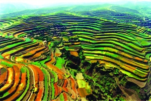 美麗的梯田不單單屬于南方,在中國西北的黃土高原上,也有一片令人神往的梯田。甘肅平?jīng)鍪械那f浪梯田,是現(xiàn)代人創(chuàng)造的奇跡。地處六盤山麓的莊浪縣,位于黃土高原溝壑區(qū),境內(nèi)山多溝深,水土流失嚴重,自然環(huán)境惡劣。20世紀60年代以來,莊浪人民克服重重困難,修成梯田近百萬畝,將昔日光禿禿的山嶺變成了一個山川秀美的“梯田王國”。1998年,莊浪干部群眾興修梯田的偉大壯舉被《人民日報》頭版頭條報道后,在國內(nèi)外引起了廣泛關(guān)注,同年莊浪縣被水利部命名為“全國梯田化模范縣”,梯田化工程被國內(nèi)外知名專家鑒定為“國際領(lǐng)先水平”,被中外人士稱譽為“世界奇跡”。