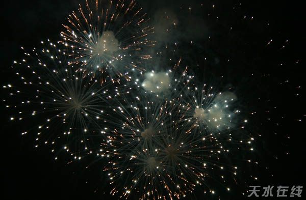 女:第三篇章是《創(chuàng)新發(fā)展》。寧靜的山河,美麗的秦安,迷人的風(fēng)景。燃放的禮花滋潤著這塊朝氣蓬勃的大地,越來越多,越來越快,仿佛踏著樂點(diǎn),在九天銀魚的帶領(lǐng)下,數(shù)枚煙花種子在中心爆發(fā),色彩向四周散開,層層疊疊,紛紛繁繁,令人眼花繚亂,飄灑輝映著滿天星光。秦安的明天必將像今晚的禮花一樣堆銀疊玉般瑰麗輝煌。本組焰火以九天銀魚、宮燈配以3-8寸高空禮花配合燃放。