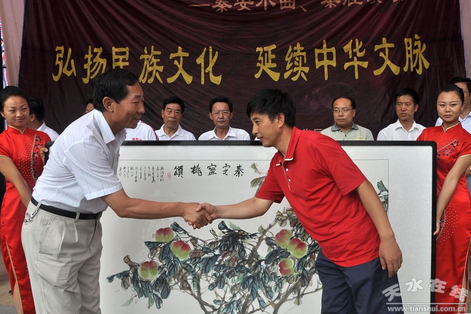 “瑤池蟠桃天上仙,秦安蜜桃在人間,凡人食得秦安果,健康益壽福心田!8月7日下午,應甘肅經(jīng)濟日報隴原風采?恐魅螐堅鱿榈难,民盟中央畫院理事,黑龍江省美術(shù)家協(xié)會理事、花鳥畫研究會理事、北天書畫院副院長兼秘書長及黑龍江日報集團畫院名譽院長宿萬盛給2009中國天水•秦安果品博覽會贈送《秦安蜜桃頌》作品。