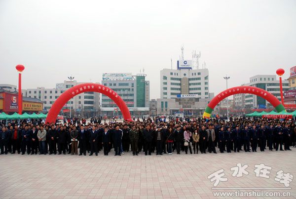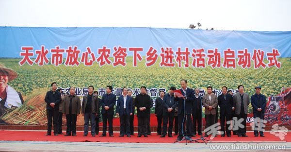3月13日,天水市放心農(nóng)資下鄉(xiāng)進(jìn)村活動(dòng)啟動(dòng)儀式在秦安縣舉行。出席啟動(dòng)儀式的有:省農(nóng)牧廳副廳長(zhǎng)楊祁峰,省農(nóng)牧廳種植業(yè)管理處副處長(zhǎng)唐繼榮,省植保植檢站副站長(zhǎng)劉衛(wèi)紅,省農(nóng)技總站科長(zhǎng)熊春蓉;天水市委副書記張應(yīng)華,副市長(zhǎng)彭鴻嘉及市委辦、市政府辦、市農(nóng)業(yè)局、工商局、質(zhì)量技術(shù)監(jiān)督局、畜牧局、供銷社等部門負(fù)責(zé)人;秦安縣四大組織領(lǐng)導(dǎo)以及縣農(nóng)資打假協(xié)調(diào)領(lǐng)導(dǎo)小組各成員單位負(fù)責(zé)人。