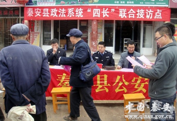 積極開展“四長”聯(lián)合接訪活動。近年來政法委組織政法各部門主要領導、業(yè)務骨干,先后在全縣各鄉(xiāng)鎮(zhèn)開展“四長聯(lián)合接訪”活動45次,接待上訪群眾2924人次,處理問題105個,化解矛盾糾紛157起,散發(fā)宣傳資料9萬多份。