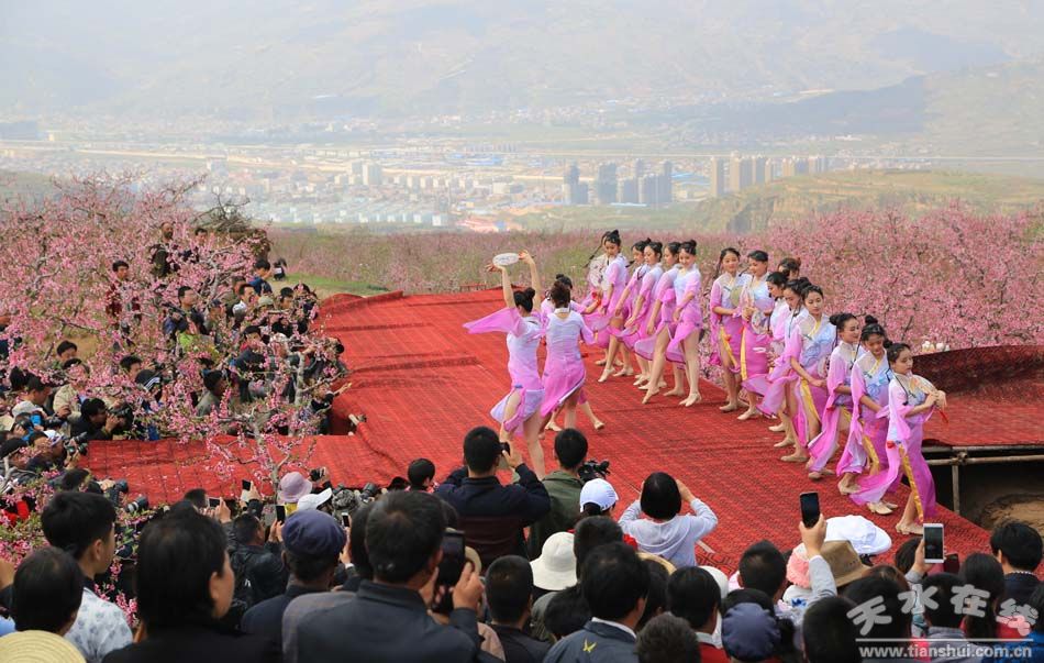 (天水市歌舞團(tuán)演員在“中國美麗田園·秦安何灣桃花景觀”演出舞蹈:《秀色》)