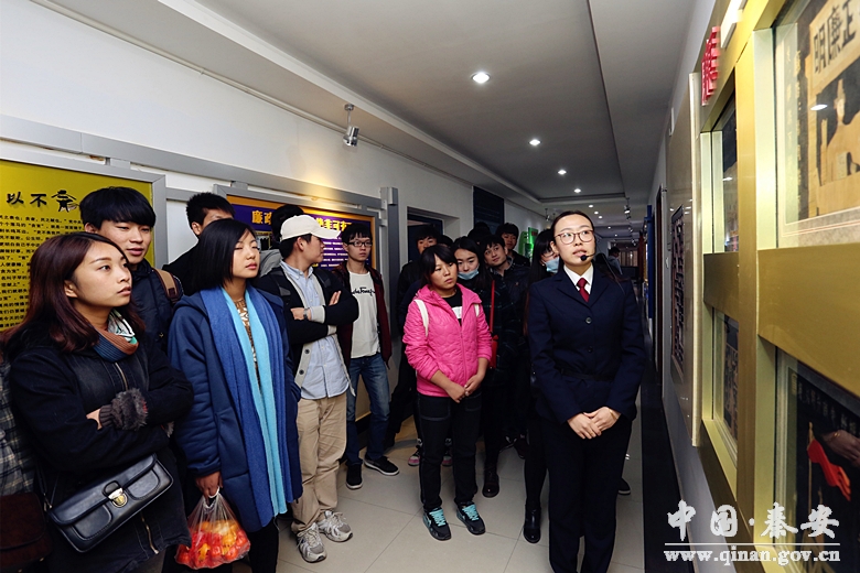 從文化長廊、廉政文化墻再到法院院史館,天水師范學(xué)院設(shè)計(jì)系學(xué)生不停地在駐足觀看和拍照留念,并不時(shí)互相討論交流。在講解員的講述中,同學(xué)們了解到秦安縣人民法院文化建設(shè)工作的設(shè)計(jì)理念和籌建程序,設(shè)計(jì)系學(xué)生劉鑫燃說,秦安縣人民法院以地域?yàn)榛A(chǔ)、以歷史為主線、以司法為主題的文化建設(shè)工作主題鮮明、思路清晰,展現(xiàn)著秦安法治發(fā)展的獨(dú)特魅力。尤其是文化長廊里的中國法治文明板塊建材以木材為主,以古書籍為展現(xiàn)形式,透露出一種歷史的厚重感,而西方法治建設(shè)通過仿制實(shí)物制成,西方法治文化也能輕松易懂。設(shè)計(jì)系學(xué)生牛秉春說,廉政文化長廊的麥稈畫很有特色,聽講解員說是秦安縣一位農(nóng)民伯伯制作的,我覺得這種民間藝術(shù)與法治文化的深度融合很贊,從另外一個(gè)角度來看也很好的傳承和弘揚(yáng)了本土非物質(zhì)文化遺產(chǎn)。