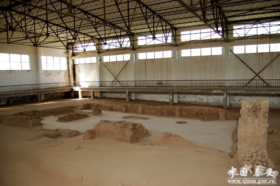 清水河上有一道小橋,橋的對(duì)面是大地灣。在那里有一處很大的院子,院里有一座類(lèi)似廠(chǎng)房的展室,入口之處突出,而在入口的右側(cè)被扒出一個(gè)寬闊的豁口,工人推著手推車(chē)將松黃的泥土推進(jìn)去。我們也從豁口進(jìn)去,發(fā)現(xiàn)里面有更多的工人,將推進(jìn)來(lái)的黃土扒開(kāi)、鋪平。而展室的中央還有一座簡(jiǎn)易的房子,透過(guò)窗戶(hù)可以看到里面有一塊潔白的地面,在暗影中發(fā)出清寂的光澤。我把照相機(jī)貼近窗玻璃,拍了幾張照片。同行的秦君說(shuō),這就是大地灣的著名遺址,是國(guó)家一級(jí)文物,有一百三十平方米,其堅(jiān)硬度超過(guò)今天的一百號(hào)水泥。有人問(wèn)工人你們?cè)囼?yàn)過(guò)嗎?工人說(shuō)哪敢,是要判刑的!展室內(nèi)部四周有一圈木質(zhì)棧道,秦君說(shuō)原來(lái)只能站在棧道上觀(guān)看,這么近的距離還是第一次。想到我們目睹的是七八千年以前的先民遺跡,怎么想都難以不翻涌感喟的微瀾。