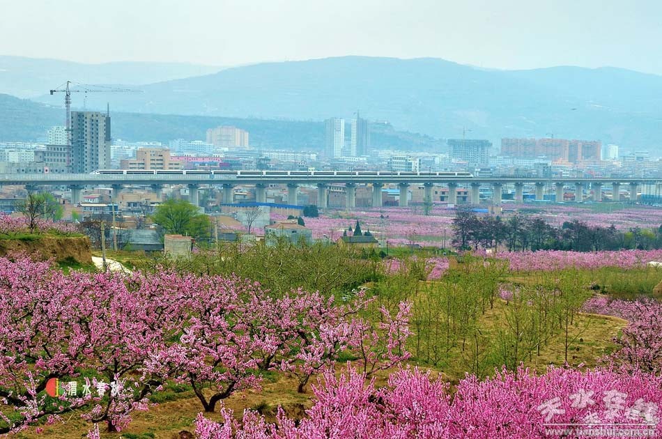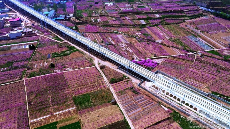 天水在線4月15日?qǐng)?bào)道 人間四月芳菲盡,秦安桃花漫山開(kāi)。眼下正是秦安桃花盛放的時(shí)節(jié),在秦安縣西川鎮(zhèn)宋場(chǎng)桃園景區(qū),枝枝桃花爭(zhēng)奇斗艷,4月14日,寶蘭高鐵線上飛馳的一列動(dòng)車(chē)在花田上空穿越,仿佛一條長(zhǎng)龍蜿蜒前行,構(gòu)成一幅蒙特奇般動(dòng)靜相間的圖畫(huà),讓人心曠神怡,美不勝收,被游客贊為“開(kāi)往春天的列車(chē)”。