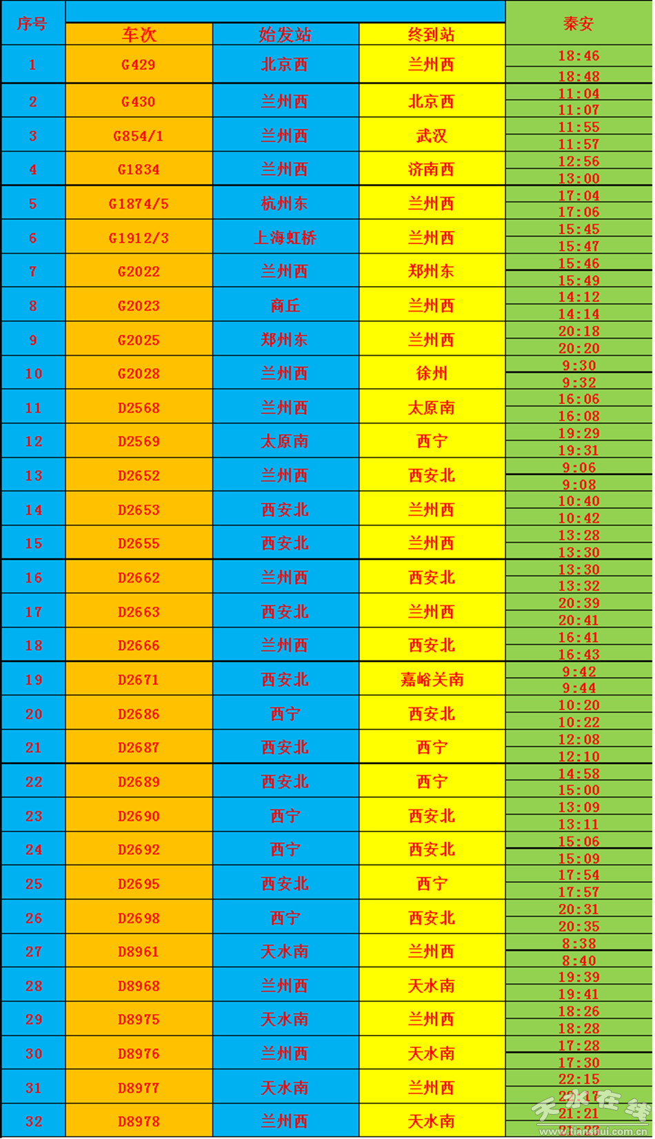 每天停靠在秦安站的動車組列車將有32趟。其中,“G”字頭動車組列車10趟,“D”字頭動車組列車22趟。