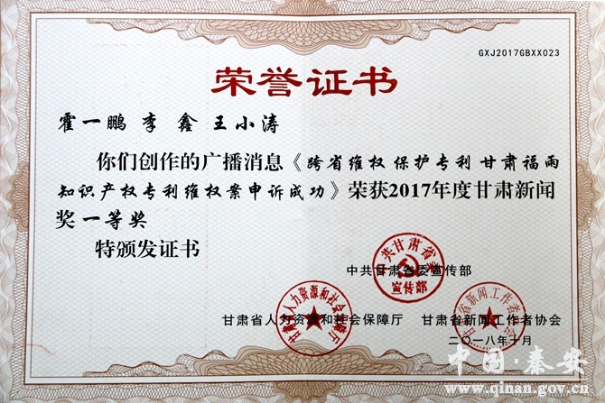 近日,2017年度甘肅新聞獎(jiǎng)獲獎(jiǎng)評(píng)選結(jié)果揭曉,由秦安縣廣播電視選送的廣播消息《跨省維權(quán) 保護(hù)專利 甘肅福雨知識(shí)產(chǎn)權(quán)專利維權(quán)案申訴成功》(作者 霍一鵬 李鑫 王小濤)榮獲一等獎(jiǎng),這是2017年度天水地區(qū)唯一獲得一等獎(jiǎng)的廣播電視類作品。
