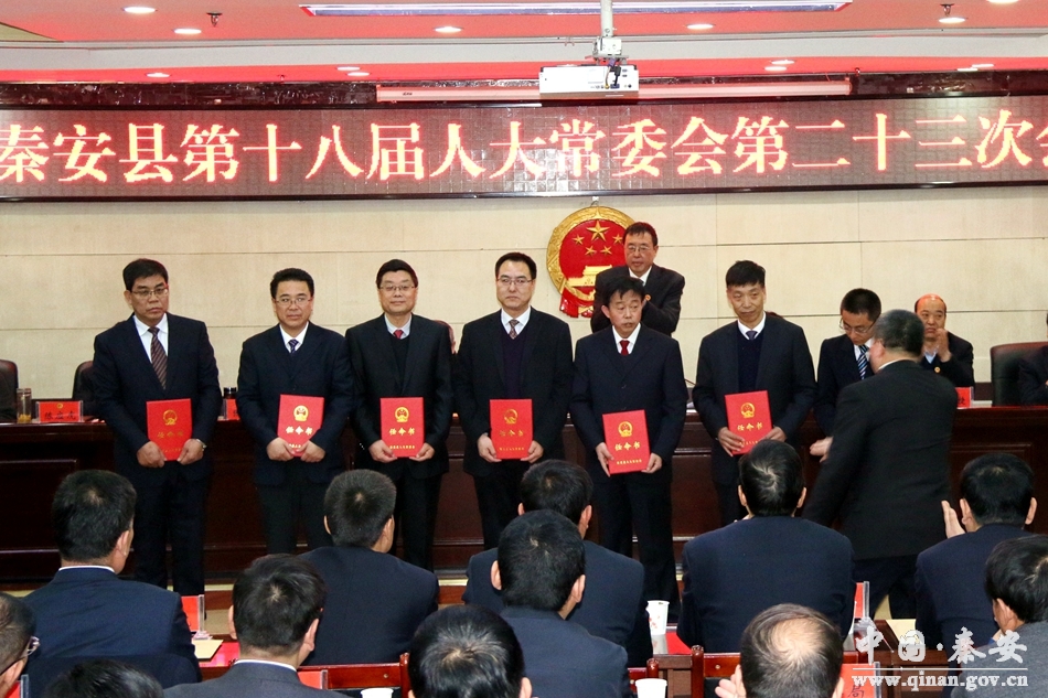 會議審議通過了縣人大常委會2019年工作要點;審議了縣人民政府關于秦安縣人民政府機構改革和工作部門設置情況備案的報告。會議聽取和審議了有關人事任免的報告,表決通過了有關人事任免事項。部分擬任職人員作了供職發(fā)言,縣人大常委會主任郭海軍為新任命人員頒發(fā)了任命書。