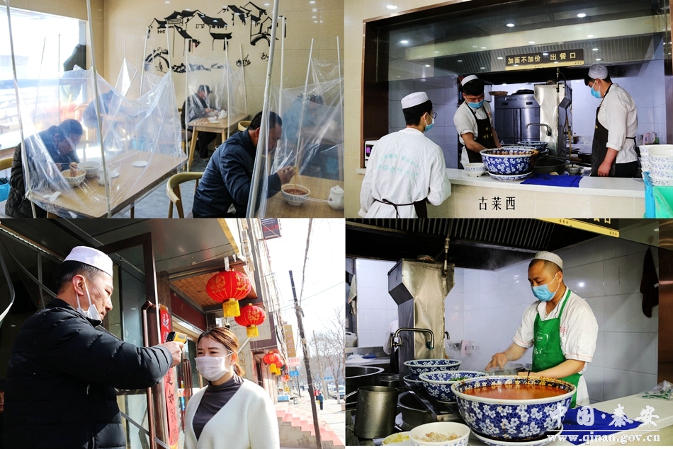在秦安縣“絲路安瀾”“古萊西”等牛肉面館,記者看到體溫測量器、酒精消毒液、食客姓名登記表、無接觸支付碼、“Z”型隔斷、“1.5米”的地標(biāo)也都成了疫情防控期間牛肉面館的“標(biāo)配”。在營業(yè)前,牛肉面館都會(huì)對(duì)員工健康狀況進(jìn)行檢查,對(duì)店內(nèi)區(qū)域進(jìn)行全面消殺,確保市民吃上“放心餐”。