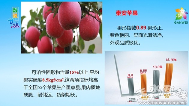 評價結(jié)果顯示,我市秦安紅富士蘋果果形指數(shù)0.89,果形正,著色艷麗、果面光滑潔凈,可溶性固形物含量和平均果實硬度均高于全國55個蘋果生產(chǎn)重點縣,其中可溶性固形物含量15%以上,果肉質(zhì)地硬脆、耐儲運、貨架期長。產(chǎn)區(qū)氣候冷涼,病蟲害少,生產(chǎn)過程中全程采取綠色綜合防控措施,年平均用藥次數(shù)分別比其他產(chǎn)區(qū)少50 %以上,保證了秦安蘋果的綠色安全質(zhì)量,是農(nóng)業(yè)農(nóng)村部認證的地理標志產(chǎn)品。