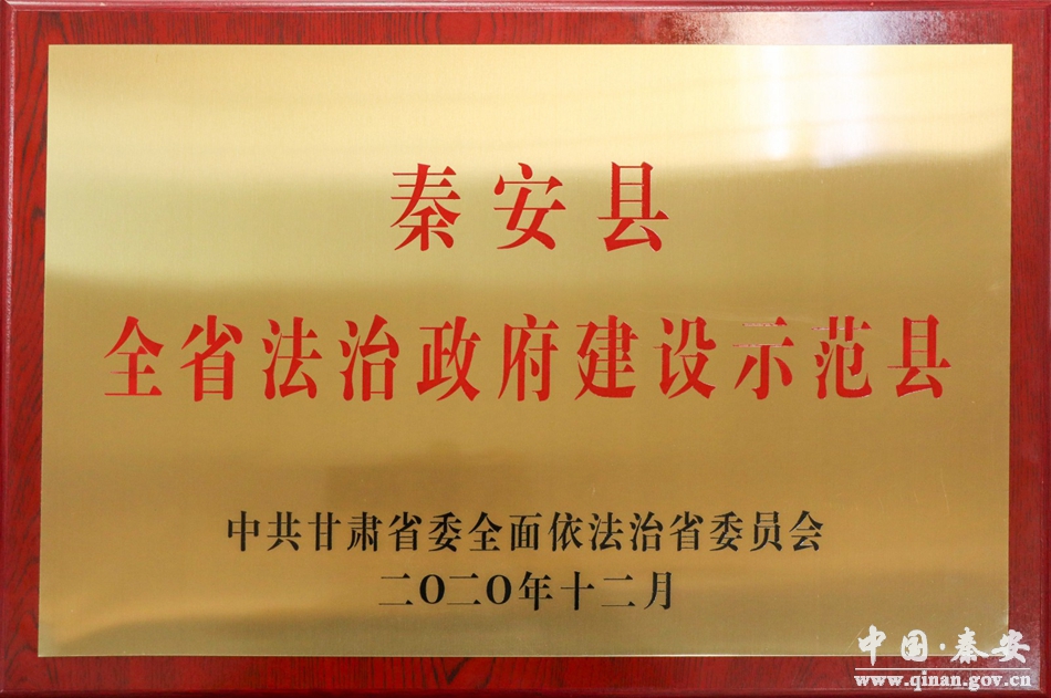 2019年,秦安縣按照《甘肅省開(kāi)展2019年法治政府建設(shè)示范創(chuàng)建活動(dòng)實(shí)施方案》要求,縣委依法治縣辦下發(fā)了《秦安縣創(chuàng)建全國(guó)法治政府建設(shè)示范縣工作實(shí)施方案》,組織開(kāi)展了法治政府建設(shè)示范創(chuàng)建活動(dòng)。示范創(chuàng)建項(xiàng)目進(jìn)行了逐級(jí)申報(bào),經(jīng)過(guò)指導(dǎo)培育、初審?fù)扑]、核查評(píng)估、第三方評(píng)估、群眾滿(mǎn)意度調(diào)查、社會(huì)公示等環(huán)節(jié),經(jīng)省委依法治省委員會(huì)批準(zhǔn),秦安縣被評(píng)為“全省法治政府建設(shè)示范地區(qū)”。