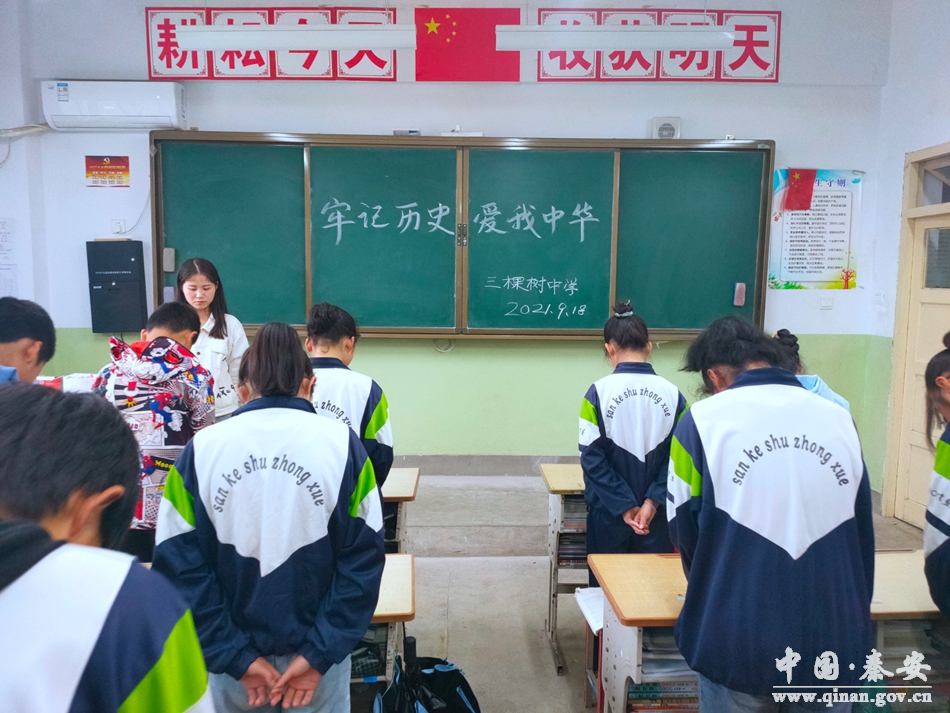 送教課開始之前,三棵樹中學(xué)組織教師給九年級學(xué)生講解了九一八事變,并組織學(xué)生進行了向在抗日戰(zhàn)爭中犧牲的先烈及被殘殺的同胞默哀儀式。