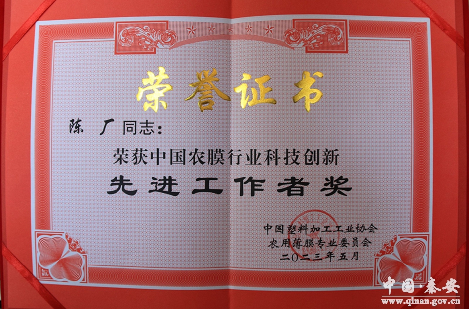 在立足自身崗位,推動(dòng)農(nóng)膜產(chǎn)品研發(fā)、技術(shù)創(chuàng)新快速建設(shè)方面,甘肅福雨塑業(yè)有限責(zé)任公司總經(jīng)理陳廠作出了表率,此次,他也被評(píng)為“中國(guó)農(nóng)膜行業(yè)科技創(chuàng)新先進(jìn)工作者獎(jiǎng)”,陳廠表示,這個(gè)榮譽(yù)是一份責(zé)任、更是一種鞭策,將再接再厲做好本職工作,激勵(lì)自己在工作中再上新臺(tái)階,給行業(yè)作出貢獻(xiàn),為縣域經(jīng)濟(jì)發(fā)展作出應(yīng)有的努力。