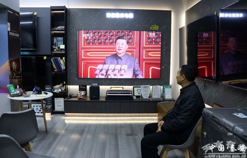 9月3日上午,秦安縣一家店鋪老板在店內(nèi)觀看紀(jì)念中國人民抗日戰(zhàn)爭暨世界反法西斯戰(zhàn)爭勝利80周年大會直播。