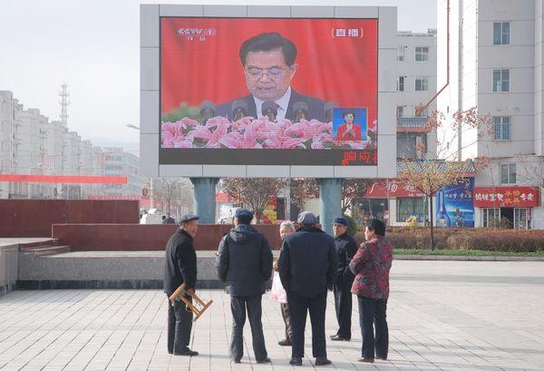 (市民通過軒轅廣場的LED電子屏收看黨的十八大)