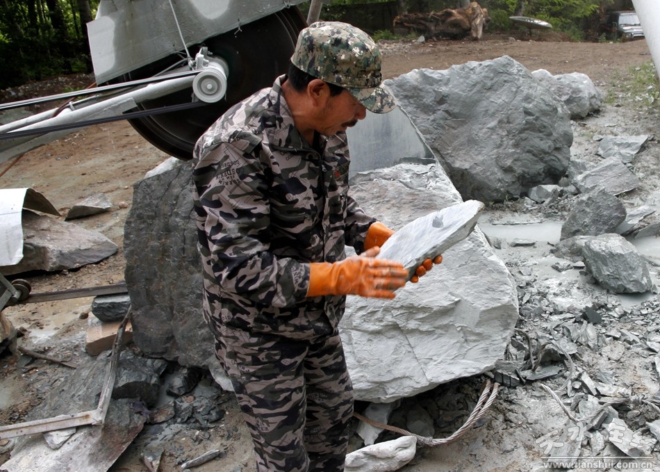 一切從選石開始,蘇衛(wèi)中從偌大的原石場里仔細(xì)尋覓,精心挑選中意的原石。挑選也有訣竅,首先看形狀,然后用水沖洗,以便觀察紋理,最后用鑿子敲打,判斷質(zhì)地。