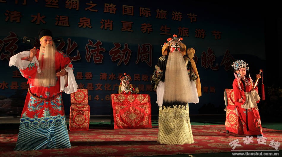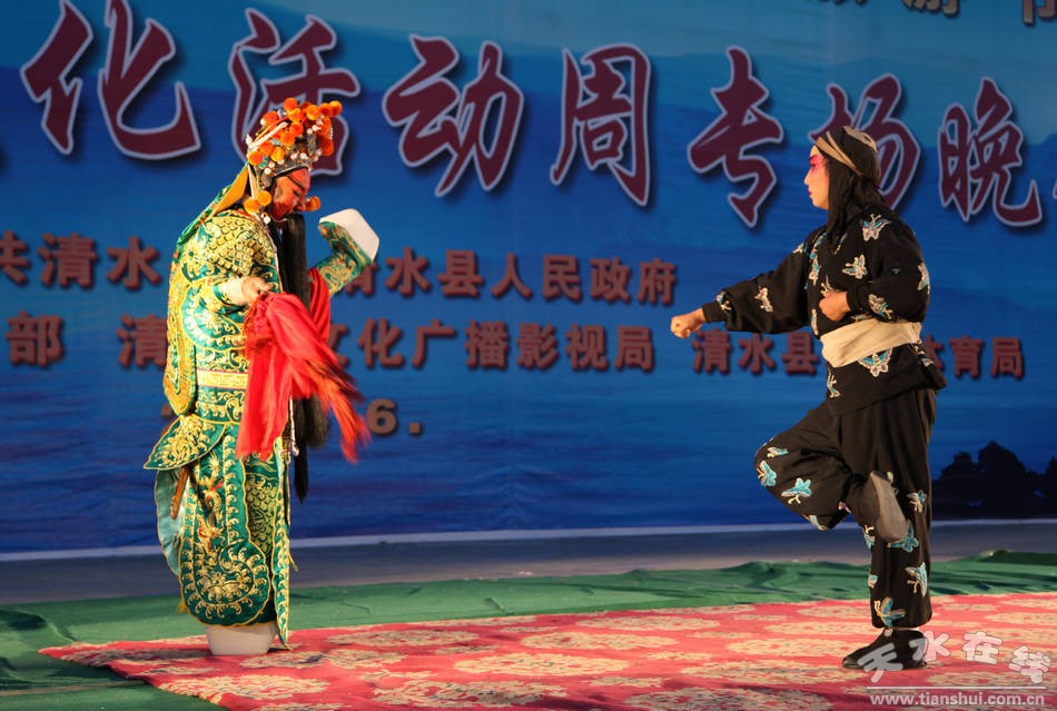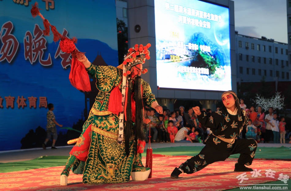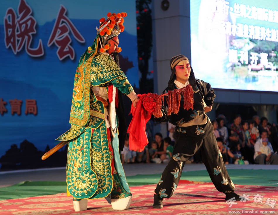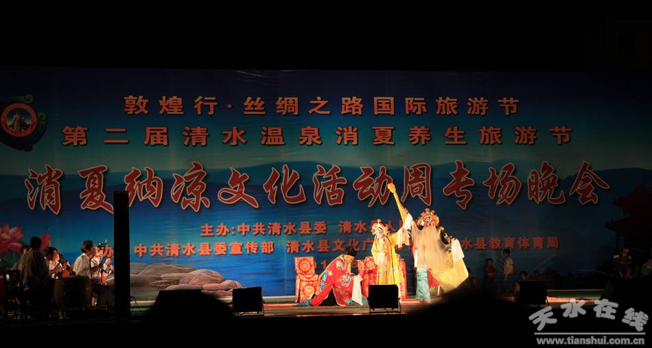 7月4日晚,敦煌行·絲綢之路國際旅游節(jié)第二屆清水溫泉消夏養(yǎng)生旅游節(jié)消夏納涼文化活動周秦腔專場演出在軒轅廣場精彩上演。精彩的折子戲《關(guān)公挑袍》、《三娘教子》、《花亭相會》和《大升官》,贏得了廣大城鄉(xiāng)干部群眾的陣陣掌聲、連連贊嘆。