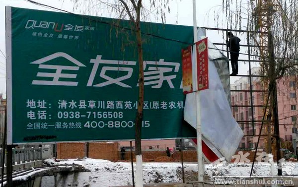 在清水縣“九個(gè)專項(xiàng)”整治活動(dòng)中,該縣執(zhí)法局按照《清水縣戶外廣告專項(xiàng)整治活動(dòng)方案》要求,堅(jiān)持全面清理、重點(diǎn)整治的原則,對(duì)城區(qū)沿街商鋪門(mén)頭牌(匾)、各類大型商業(yè)宣傳廣告、城市“牛皮癬”及過(guò)街商業(yè)宣傳橫幅進(jìn)行全面清理整頓。