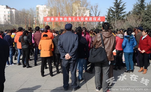 2月17日,清水縣為2017年農(nóng)村外出務(wù)工人員舉行歡送儀式,240多名務(wù)工人員當(dāng)天乘坐大巴,遠(yuǎn)赴山東開始他們今年的“淘金”之路。