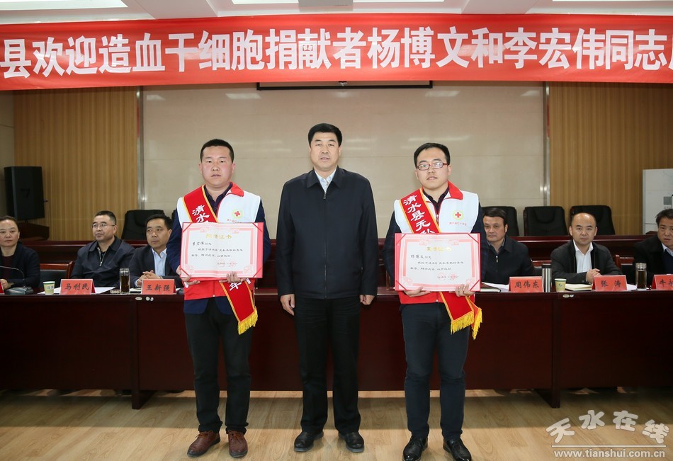 甘肅省兩位新近完成造血干細胞捐獻的志愿者——甘肅中醫(yī)藥大學碩士研究生楊博文、天水市清水縣基層公務員李宏偉,他們作為土生土長的清水人,分別于今年3月2日、3月15日在北京、西安成功捐獻了造血干細胞,為兩位白血病患者送去了生的希望。3月20日,省政府李斌副省長親切接見了楊博文和李宏偉及其家屬,省紅十字會為楊博文同學和李宏偉同志分別授予“甘肅省紅十字會博愛金獎”;3月22日,副市長張建杰又代表市委、市政府作了接見,市紅十字會為李宏偉授予“天水市首例造血干細胞捐獻者”榮譽稱號。